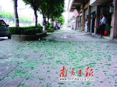 昨日,記者再次來(lái)到事發(fā)地看到,警方仍未解除警戒線,幾名民警在現(xiàn)場(chǎng)緊張勘察。事發(fā)街道兩旁的玻璃碎片仍是灑落一地,離爆炸核心位置20多米遠(yuǎn)的一家修理店老板介紹,很多玻璃碎片都是從對(duì)面街道飛過(guò)來(lái)的,他指著一塊插入卷閘門的石頭說(shuō):“這個(gè)也是從對(duì)面飛過(guò)來(lái)的,當(dāng)時(shí)爆炸的威力太可怕了!