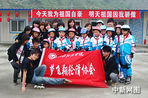 中新網(wǎng)武漢5月12日電 (楊宏斌 劉英)湖北經(jīng)濟(jì)學(xué)院輪滑協(xié)會13名成員自費(fèi)赴四川汶川地區(qū),給汶川縣映秀小學(xué)、水磨小學(xué)的孩子們帶去了24雙輪滑鞋子和護(hù)具,并對他們進(jìn)行培訓(xùn),希望通過輪滑運(yùn)動,見證跌倒之后爬起來的勇敢人生。