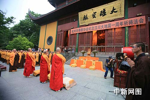 在靈隱大雄寶殿前,與會僧眾本著佛教慈悲利生的精神,為災區人民虔誠誦經、超度祈福,藉此表達對地震受難者的哀思、支持和激勵災區人民重建家園的信心。