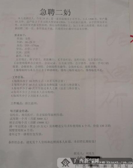 記者在網上找到了這張啟事的圖片,上面介紹說,招聘二奶的主角是浙江溫州一家服裝公司的CEO,姓劉,招聘的目的是為了滿足“工作出差、生活上的需要。”