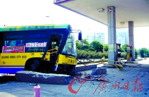 記者接報趕至時看到,一輛公交車斜跨在加油站水泥地上,車頭玻璃裂成網狀,前車門傾斜,地面到處是玻璃片,粗大的水泥護欄也被撞斷成兩截,“摔”在車頭前。距離車頭一米處,是一個折斷的路燈。