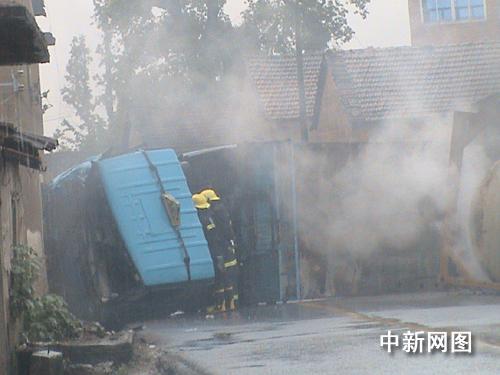 消防隊員趕到現場時,只見一輛槽罐車側翻橫在村道中間,車頭部將右邊車道旁的兩間房子撞了兩個大窟窿,整個槽罐已脫離車身,躺在路邊水溝內,泄漏的硫酸不斷流入旁邊的水溝,冒出白色的煙霧,空氣中充滿了刺鼻的味道,幾百米外都能聞到。消防隊員在現場,明顯感到喉嚨干澀,許多村民用毛巾、衣角捂住口鼻,退至安全地帶。