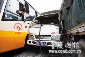 昨下午1點半,記者在事發(fā)地雙碑石井坡車站紅綠燈處看到,一輛長安小貨車卡在805路公交車和另一輛貨車之間。長安小貨車車體嚴(yán)重變形,擋風(fēng)玻璃全部被撞爛,碎玻璃撒了一地。公交車和另一輛貨車,車身上都有重重的擦損痕跡。