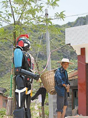 昨日,記者在這則《真牛,村民把變形金剛當門神》帖子的照片上看到,一個巨大的黑色變形金剛模型,筆直的立在一民房外的木桿旁,從模型身上連接的電線可以看出,這應該是一個電動玩具,變形金剛旁還站著一位背著背簍,戴著草帽,滿臉黝黑的老伯,似乎對身邊的模型早已習以為常。