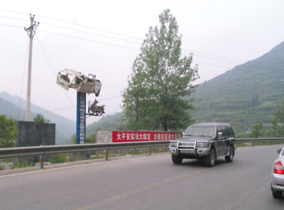 在國(guó)道一旁,一部只剩癟形外殼的汽車被高懸在近20米的半空中,令過(guò)往此地的司機(jī)無(wú)不瞠目結(jié)舌。近日,被稱之為“最牛交通安全警示教育基地”的照片出現(xiàn)在大渝網(wǎng),其極富創(chuàng)意的宣傳方式讓眾多網(wǎng)友拍手稱贊。
