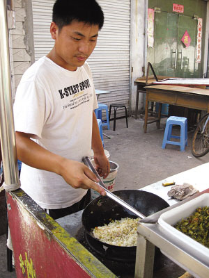 鮑斌是揚(yáng)大體育學(xué)院03級學(xué)生,因?yàn)榧彝ソ?jīng)濟(jì)困難,讀大三的時候,小鮑決定休學(xué)創(chuàng)業(yè),選擇的創(chuàng)業(yè)項(xiàng)目是再普通不過的蛋炒飯。他沒有向父母透露半點(diǎn)風(fēng)聲。在外面租了一間房子,開始了創(chuàng)業(yè)歷程。開始,小鮑的生意不是很景氣,后來,大伙對他的手藝認(rèn)可后,生意便開始紅火起來!拔颐刻鞙(zhǔn)備的炒飯都會比別人賣得快,所以經(jīng)常早收攤,算下來,平均一天能賣幾百盒。”鮑斌一臉興奮地告訴記者,刨去成本、平常的開銷,每年掙10萬元非常輕松。因?yàn)樯庠絹碓交,他給淮安老家的父親打了個電話,請二老過來幫忙。從此兩個老人正式給兒子打起“下手”來。