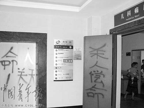 自從李醫生逃脫后,死者家屬便每天到醫院示威。據院方提供的材料,6月29日,死者家屬聚集40余人在醫院門診、急救中心大廳燃放鞭炮、焚香、燒紙錢、擺放花圈,堵塞急救中心車輛通道,阻礙120急救車輛進出,在門診部、急救中心電梯口、墻壁等處噴灑黑漆,寫上“殺人償命、還我女兒”等字;6月30日,死者家屬再次聚集20余人在醫院急救中心大廳燃放鞭炮,急診科搶救室有大量的氧氣瓶和各種搶救設備,萬一引起燃燒或爆炸,后果不堪設想;7月1日,死者家屬在門診大樓外拉橫幅,放鞭炮,將紙錢拋撒進收費處窗口。院方說,這種聚眾鬧事的行為,嚴重干擾醫院正常診療秩序,搞得醫務人員人心惶惶,無法安心工作。院方認為,死者家屬不愿通過正常渠道解決問題,并拒絕尸體解剖,“企圖通過鬧事來擴大事端,給醫院造成負面影響,對醫院施加壓力,從中牟取經濟利益”。