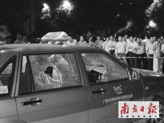 昨日凌晨2時40分許,在天河體育中心東門口,被打的哥李師傅臉上的幾處血痕在夜色中清晰可見。在其身后,其駕駛的綠色的士四個車窗全被砸出大洞。的士車后,是一輛熄火的寶馬730i轎車,遠處還有一輛黑色別克轎車。兩車均為粵A牌照。