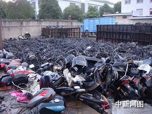 中新網(wǎng)寧波7月8日電(何蔣勇 歐陽(yáng)峰)7日下午5時(shí)50分許,位于浙江省寧?h興寧中路45號(hào)的寧?h物資再生利用有限公司發(fā)生一起火災(zāi),濃煙沖天達(dá)百余米高,整個(gè)寧?h城都能清楚地看到黑煙滾滾。當(dāng)?shù)叵啦块T(mén)先后出動(dòng)四輛消防車(chē)、近四十余名官兵參與火災(zāi)撲救,約40分鐘后成功將大火撲滅,但是該公司露天堆場(chǎng)內(nèi)近百輛廢舊摩托車(chē)被大火燒成骨架。