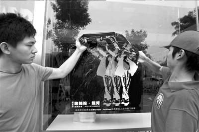 歌迷和飯店服務員一起撕毀貼在玻璃上的海報。本報記者張沫攝