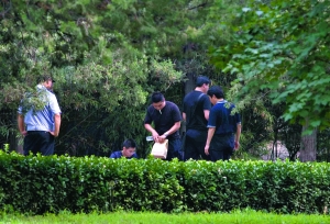 王明說,起初,藍衣男子出門后向東逃跑,跨進了銀行旁的綠化帶,然后向南前行了幾步,隨即馬上轉身,沿反方向跑去。到達銀行對面的綠化帶時,他和保安堵住了該男子。但藍衣男子沖著二人將瓶子里的無色液體灑出,隨后繞開他們,繼續向北跑去,很快就不見蹤影。