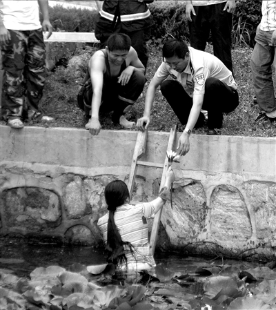 7月14日,江蘇濱?h一名患狂躁癥的女子跳進(jìn)縣政府前的護(hù)城河中,并在水中脫光衣服,威脅救援人“要自殺”。最后,民警和消防員用兩張百元鈔票將其“引誘”上岸。