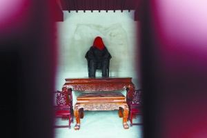 這座尚未完工的四合院風(fēng)格祠堂,朱紅色的圍墻四周,花崗巖雕成的石欄環(huán)繞。院內(nèi)東西廂房內(nèi)分別擺設(shè)著整體浴缸和木質(zhì)仿古雕木床。正房中擺放著一座3米高的銅像。