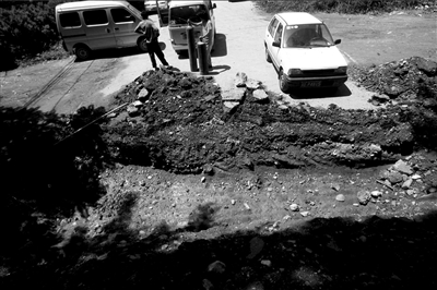 昨天下午,復地灣流匯別墅區門前,6米寬的柏油路被橫挖開一道近1米深的溝,10多輛車停在溝邊。住在別墅區一期的一位業主稱,此路于18日下午被挖斷,業主們只能將車停在溝邊后步行回家,正在裝修的業主則因道路不通而不得已停工,“也不知到底因為什么,但太霸道了”。
