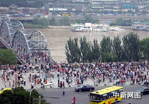 中新網蘭州7月22日電 (記者 劉薛梅) 為觀看500年一遇的罕見天象日全食,7月22日一大早,甘肅蘭州百年鐵橋中山橋廣場陸續聚集了近千人,借助西北師大天文臺提供的專業觀測設備,欣賞蘭州上空出現的日偏食。