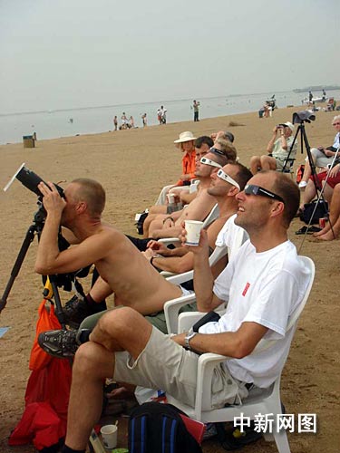 當(dāng)天早晨七點(diǎn)左右,記者來(lái)自上海市郊的金山城市沙灘。在這一被稱為本次日全食中國(guó)最佳觀測(cè)點(diǎn)之一的沙灘上已經(jīng)聚集了一千多名境外天文愛(ài)好者。據(jù)悉,此次“跨國(guó)追日”活動(dòng)是由上海、江蘇、云南三地的八家旅行社策劃組織的,成員分別來(lái)自美國(guó)、加拿大、意大利、西班牙、荷蘭、瑞典、丹麥、日本、泰國(guó)等國(guó)家。