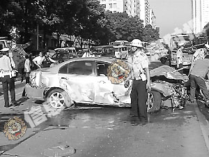 事發路段在東風路農林立交處,被橫掃的道路中心鐵護欄長達30多米,附近路面到處是鐵欄桿。一根鐵桿甚至插進肇事銀白色小轎車的車頭部位,另一根插進車下軸承部位。駕駛室內安全氣囊爆破血跡斑斑。