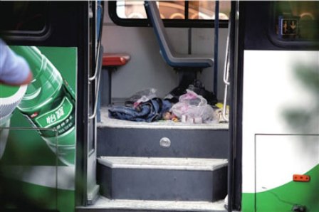 記者看到,公交車前車門處滿是灰色粉末,一條淡藍色牛仔褲、一袋蘋果和一些塑料袋堆在車門附近。附近居民猜測,那里正是嫌疑人意圖縱火的位置,“警察一直在那附近拍照,那些東西可能也是救火時留下的。”
