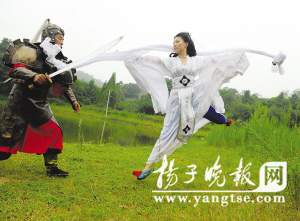 “江湖笑恩怨了,人過招心不老……”4日下午2點,南京江寧區南山湖景區儼然成了古裝戲的外景地,3對年輕男女在此像模像樣地演繹個性“私人電影劇照”,——將《神話》、《神雕俠侶》、《十面埋伏》等古裝武俠電影中的經典場景翻版演繹,用他們的話說,著實圓了一回都市人的“成人童話夢”。