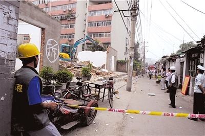 這處違法出租大院位于東木樨園11號樓和13號樓中間。昨天上午9點多,隨著豐臺區城管人員一聲令下,一輛小型挖掘機將吊臂揮向一堵墻面,墻面應聲轟塌。“你看,磚墻里都沒有水泥,只有沙土。”豐臺區東鐵匠營街道辦事處一名工作人員邊說邊指給記者看,“這樣的房子出租,安全隱患太大了。”拆除工作引來數十名居民觀看。聽說以后這塊地要建成健身場所,居民們都特別高興。一位大媽說,小區周圍沒有綠地,也沒有健身地方,居民們鍛煉一直特不方便。