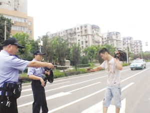 該男子出現(xiàn)之后,很快在附近人行橫道上就圍滿了群眾,大家都遠(yuǎn)遠(yuǎn)地站著,紛紛議論起來。“不會是在拍電影吧?也沒有看到攝像機啊?”就在周圍群眾七嘴八舌地議論著的時候,幾輛警車呼嘯而至。