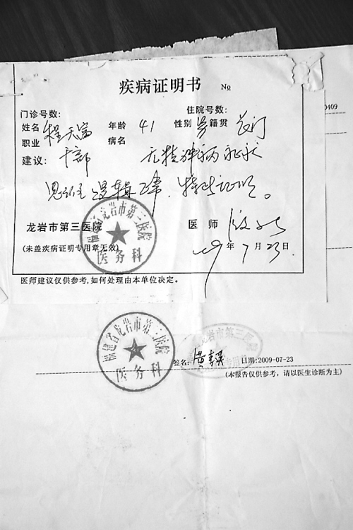 2009年7月18日,程天富從精神病院第四次出來,擔心呆在長汀還有被抓進精神病院的危險,但又無法證明自己沒有精神病,遂到龍巖的醫院就診。