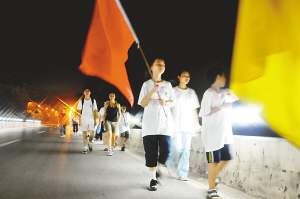 8月8日凌晨4點,白天喧囂的洋人街一片靜悄悄。數十名男女身穿統一的T恤,手拿礦泉水瓶,堅定地朝前走。頭天深夜從大禮堂出發,沿兩路口、長江大橋,到南濱路、彈子石洋人街,他們已走了一個通宵。