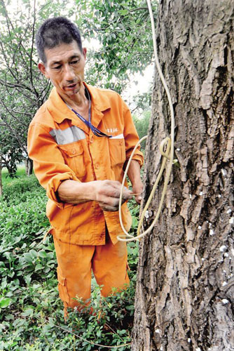 看著這些傷痕累累的大樹,江師傅心疼得流淚了,他往受傷的樹木身上抹了黑色的“愈傷涂抹劑”,希望大樹仰仗著幾十年的樹齡,能重新煥發生機。江師傅很難過:“我天天和這些樹在一起,現在它們受傷了,我想把它們救回來,可是,傷得這么重,誰知道還能不能存活啊。”