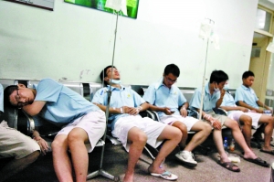 昨日凌晨,北醫三院急診大廳內擠滿了身穿“北京郵電大學”服裝的輸液學生。
