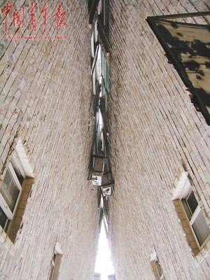 再抬頭向上一看,張先生發現6棟和7棟兩棟樓越向上貼得越近。他大吃一驚,交房不到5年的樓居然傾斜了。