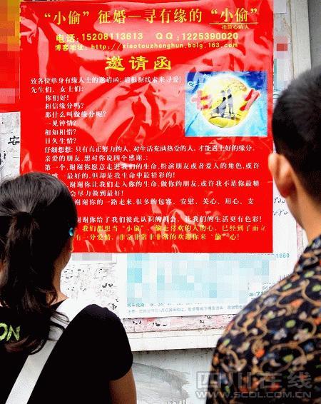昨(25)日,沙灣路128號小區門口的告示欄里貼出一張大紅色的“邀請函”:“小偷征婚,征有緣小偷,共度七夕”、“小偷征小偷,生個小小偷。”正當圍觀者面露鄙夷時,有眼尖的市民發現,此“小偷”非竊取錢財之輩,“別人是偷心的賊。”
