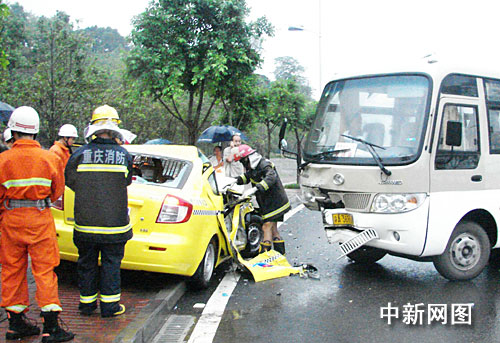 中新網重慶8月29日電 (張東清 孟幻)8月29日早上7時許,天降暴雨,一輛出租車在行駛到該市巴南區魚洞江濱路時,迎面與一輛交通車相撞。該事故造成3人重傷,1人輕傷。