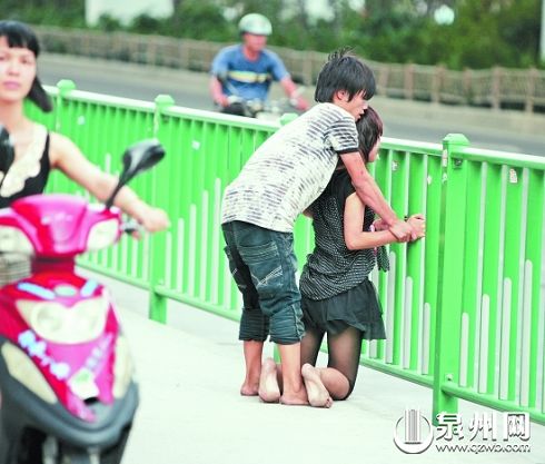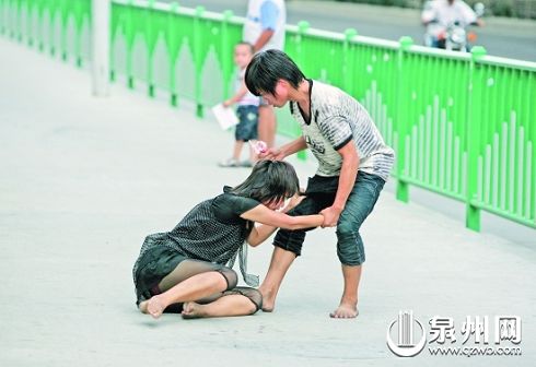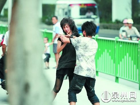 昨日下午4時15分許,泉州市區坪山路與寶洲街交界處的鑫億大廈樓下,一對雙雙赤腳的青年男女拉拉扯扯大聲爭吵,引來路人圍觀。
