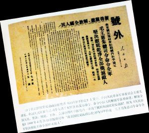 “這本書里我精選了其中的312張?zhí)柾猓渲杏薪夥艖?zhàn)爭時(shí)期人民解放軍解放30個(gè)省會(huì)城市和許多大、中城市時(shí)發(fā)行的報(bào)紙?zhí)柾猓约啊髴?zhàn)役’、渡江戰(zhàn)役等號(hào)外。特別是10多張開國大典號(hào)外,見證了毛主席在天安門城樓上宣告‘中華人民共和國中央人民政府已于今日成立了’的偉大歷史性時(shí)刻。”張挺自豪地說,書中收藏的大部分號(hào)外是首次面世,其中最珍貴的有兩張:一張是1949年4月21日《人民日報(bào)》出版的號(hào)外“南京國民黨政府拒絕國內(nèi)和平協(xié)定毛主席朱總司令命令全軍堅(jiān)決徹底干凈全部殲滅敵人”;另一張是1949年4月24日,解放軍攻入太原,當(dāng)日《人民日報(bào)》出版“南京反動(dòng)政府宣告滅亡狼狽奔逃我正向南京急進(jìn)各界已成立治安維持委員會(huì)致電毛主席歡迎解放軍入城”的號(hào)外。