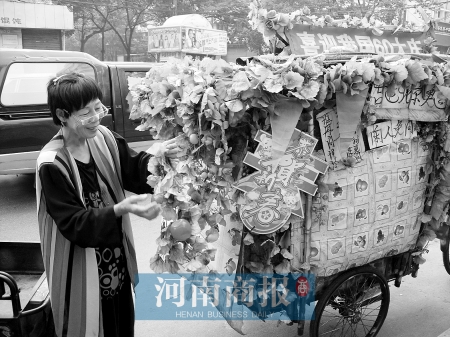 昨日上午10時(shí)許,一輛披著鮮花,插著國旗的彩色三輪車出現(xiàn)在鄭州市經(jīng)八路上。