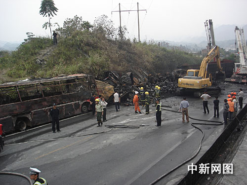 中新網(wǎng)南寧十月十八日電 (王剛 王越川)十八日凌晨三時(shí)許,廣西南丹縣境內(nèi)發(fā)生四車(chē)相撞慘烈事故,造成包括大客車(chē)在內(nèi)的三輛大型車(chē)輛被燒毀,至少十五人受傷,其中三人重傷。