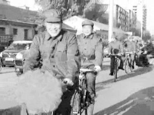 昨日上午,一支身穿綠軍裝、腳蹬二八自行車的迎親隊伍出現(xiàn)在街頭,立刻賺足了路人的“眼球”。