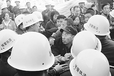 就在這時,眼看房子就要被拆掉,在一旁圍觀的3名村民顯得很激動,他們將挖掘機(jī)圍住,并將挖掘機(jī)司機(jī)拉下了車。為了防止發(fā)生意外,執(zhí)法隊員站成一道人墻阻止村民進(jìn)入。但是村民并沒有罷休,而是開始破口大罵,并強行沖擊人墻,試圖進(jìn)入磚塊亂飛的拆遷現(xiàn)場,現(xiàn)場情況一度很緊張。在執(zhí)法隊員的極力阻止下,村民才沒有沖入拆遷現(xiàn)場。