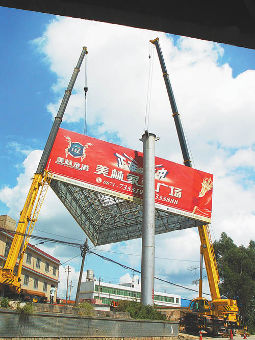 9月18日,記者在昆明國際會展中心附近看到,兩棵單立柱廣告牌正在被大吊車吊起。隨后幾天,記者在昆明的城南、城北地區(qū)都看到有關部門在拆除戶外廣告牌。記者從昆明市城管局獲悉,截至9月24日,昆明市主城區(qū)共拆除單立柱200棵。其中,五華區(qū)、高新區(qū)、度假區(qū)、呈貢已提前完成拆除任務。盤龍區(qū)、經(jīng)濟技術開發(fā)區(qū)也開始拆除高等級道路兩側的單立柱廣告。在昆明當?shù)兀S嗟膯瘟⒅鶑V告已經(jīng)屈指可數(shù)。