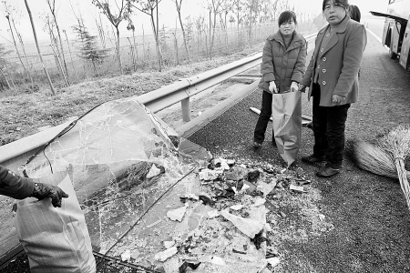 此時,距離3輛車相撞不到100米的路對面,西安前往富平方向的車道上,一輛從西安到合陽的大客車,車前駕駛室位置已經完全凹陷,駕駛座椅被撞得掀起,車頭左前角已殘破不堪。一位中年女士臉上掛著血跡,正站在高速路邊,一臉地焦灼。她姓孟,就是這輛受損客車的車主,正等候拖車拖走事故車。她告訴記者,她的車上拉了15名乘客。“大約10點半,走到這兒看見前面有消防車,像是出事了。霧太大,還沒看清楚咋回事,玻璃就飛濺到臉上了。這才意識到追尾了,‘追’了前面的一輛油罐車”。