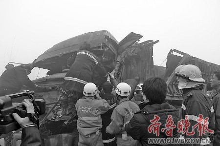 由于霧很大,高速公路上能見度不足20米。在距離聊城東出口約2公里處,由東向西行駛的四輛大貨車連環撞在一起,其中兩輛已經沖向中間綠化帶,一輛車沖過高速護欄,橫停在路右側,車頭已損壞,有一名傷者蓋著被子躺在綠化帶中。