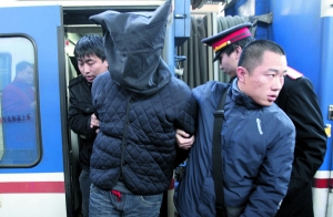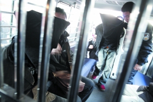 昨日上午,T232次列車進站,旅客中有一群戴著手銬、蒙著頭套的特殊旅客,他們在民警看管下被押上警車。