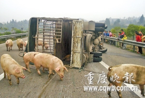 昨日,豬販汪祥全受到處罰。來自市高速公路支隊的消息稱,近幾年,高速公路上不時出現運輸生豬貨車翻車后豬群亂串的狀況,其中曾有100多頭豬在成渝高速路亂串,先后引發4起車禍、3人受傷,道路封閉4小時。