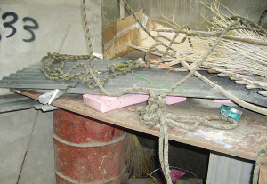 進入工地大門,記者看見了一個門衛室,有一個圈著電纜的鐵環固定在屋檐下,工地上的工人表示,小偷被抓到后,就是被繩子捆住然后吊在這個鐵環上面的。而在門衛室一旁還有一個狗窩,狗窩上散落著許多雜物,其中就有當初用來捆小偷的繩子。在狗窩一旁,還有一口袋扣件,這就是小偷偷竊的工地東西,工人表示,這些扣件如果拿出去賣,至少能賣百來元。對于用繩子捆住小偷又吊起來,工地上的工人并沒有否認,“是有這回事,那么多人都看到了,后來警察來了,才放下來!”一位工人告訴記者,可是當記者問是誰把小偷吊起來的時候,這名工人搖頭稱不知道。
