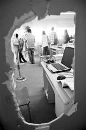 昨日上午,當記者來到這家公司時,只見兩間辦公室里的大部分辦公桌上已是空空蕩蕩,本該放著臺式電腦的地方,只剩下配套的鼠標和鍵盤。而在兩間辦公室的墻上,分別留下了兩個形狀各異的洞。這兩個洞分別長不到1米,寬50公分左右,都又短又窄。公司的汪小姐稱,小偷肯定是從這里鉆進辦公室,然后打開辦公室的門行竊的,因為辦公室的門鎖并未損壞。
