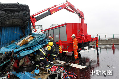 今天早上8時許,高速寧波支隊指揮中心接到報警稱在繞城高速姜山北互通附近有兩車追尾,有人受傷,且傷勢較重。接警后,四大隊巡邏民警立即趕赴現場。到達事故現場后,民警發現肇事的是蘇FU3033車牌號重型廂式貨車和閩A15387號重型廂式貨車。其中后車閩A15387號大貨車駕駛室已經嚴重變形,駕駛室在碰撞后,被擠壓成厚度不足1米的“鐵餅”。透過碰撞的殘骸可以隱約看到有兩人被困車內,氣息十分微弱。現場民警在展開施救同時,立即要求增援。8時26分,鄞州消防大隊接到指令后立即出動1輛搶險救援車、7名消防官兵趕赴現場。