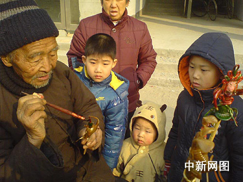 中新網(wǎng)偃師1月19日電 (記者 曹錚 通訊員 盧班)今日上午,在偃師電視臺(tái)東邊記者發(fā)現(xiàn)一耄耋老人正在為一年輕人制作“吹糖人”。