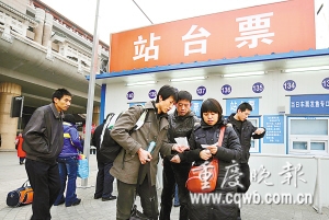 一個(gè)成功率不足10%的回渝攻略,正被很多農(nóng)民工相互交流著,因?yàn)樗挥脫?dān)心買到票販的假票,也不用花錢買高價(jià)票,只要買一張面值1元的站臺票,就有可能搭上回家的列車。