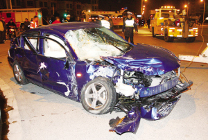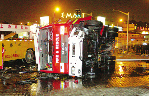 昨天(19日)下午5時15分許,(上海)浦東御橋路浦三路口處發生意外,一輛消防車與一小轎車在行駛中發生碰撞,消防車在沖倒路邊的欄桿和燈柱后側翻在地,小汽車則被反向甩出近20米遠,車內一名新婚女子和一3月大的男嬰身受重傷,情勢危急,另有十余人輕傷。