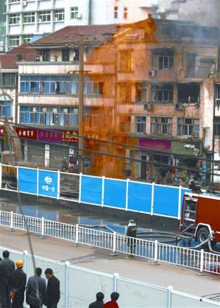 昨日被挖破的管道,就坐落在黃浦大街246號一棟4層樓的私房門前,該私房底層是三間臨街的門面,樓上住著兩戶人家還有兩位老人,眾人顧不得收拾家中財物趕緊往外撤。鄒姓房東告訴記者,該棟樓的一半財物基本都在大火中被燒毀,他一大家子人沒地方過夜,被安排到近旁的揚(yáng)子江飯店落腳。